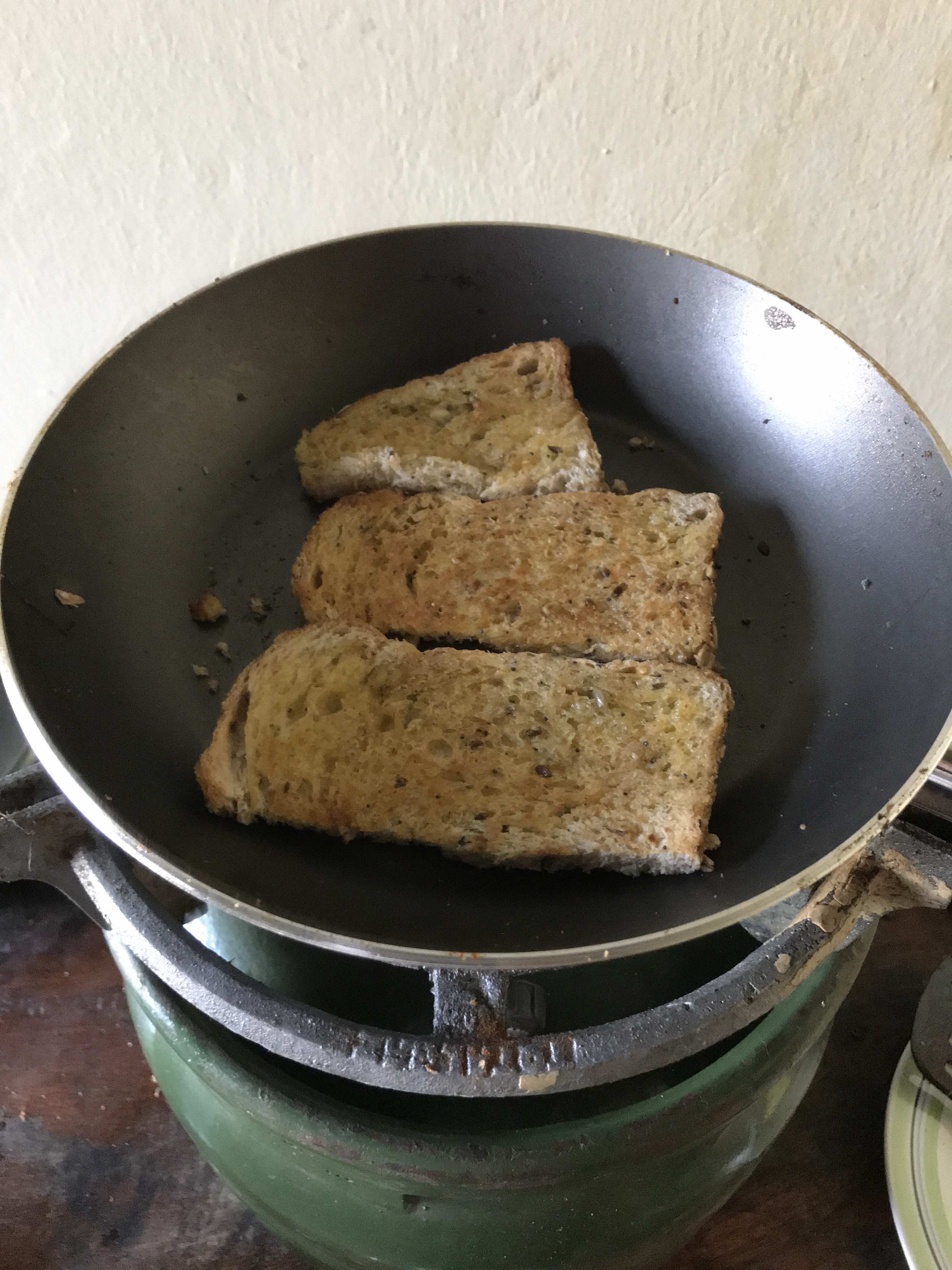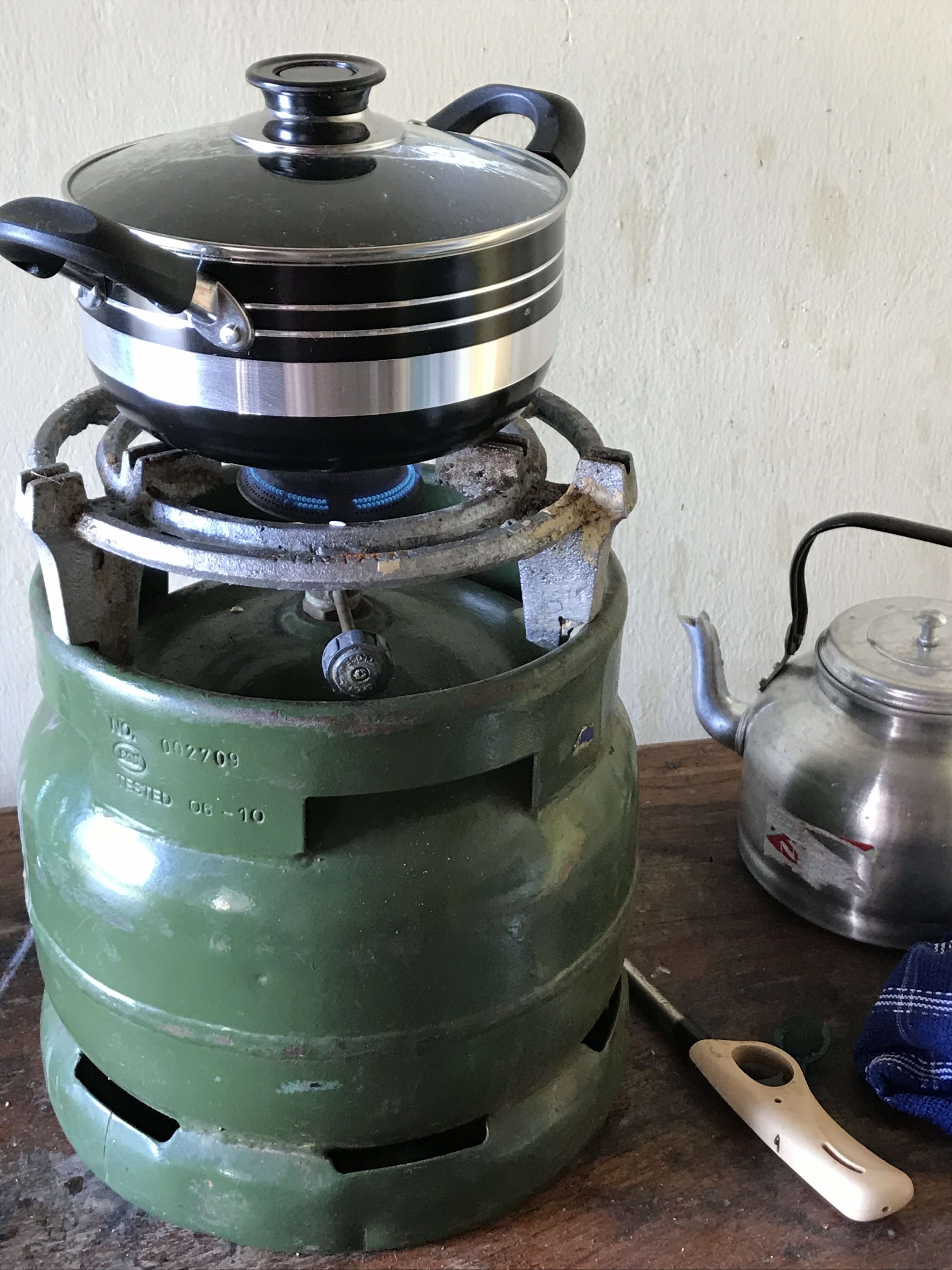 Für’s Frühstück wird zuerst Kaffee-Wasser im Kessel auf dem Gaskocher heiß gemacht und dann das Brot in der Pfanne getoastet. Sonst ist das Brot hier dermaßen labbrig und weich, dass man nicht einmal Butter drauf schmieren kann.Aber ich gewöhne mich sehr raschan die neuen Bedingungen, sind ja nicht mehr ganz neu, da ich schon im Jänner/Feber dieses Jahres dreieinhalb Wochen hier war.